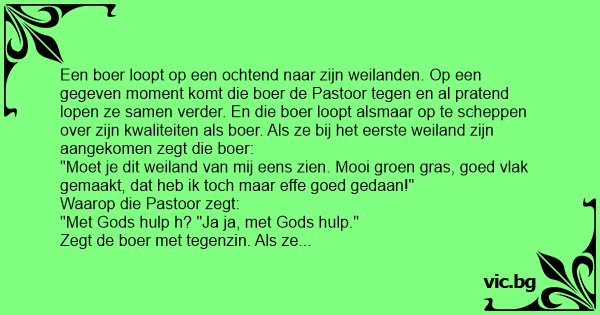 "Ja." zegt de boer. "Nou” zegt die Pastoor dit ziet er niet zo mooi uit met al dat onkruid en stenen en zo.".