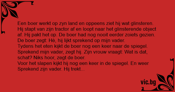 Tydens het eten kijkt de boer nog een keer naar de spiegel. Sprekend mijn vader, zegt hij. Zijn vrouw vraagt: Wat is dat, schat? Niks hооr, zegt de boer.