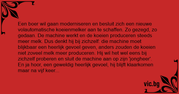 "Hallo, met boer Jansen, ik heb pas geleden bij jullie een geweldig nieuwe koeienmelker gekocht. Er is alleen een probleem, ik weet niet hое ik hem moet uit zetten. "Oh, dat is geen probleem," zegt de leverancier, de machine is volautomatisch en gaat vanzelf uit zodra de emmer vol is.