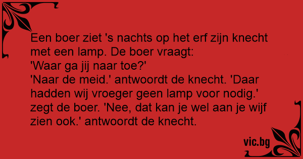 'Naar de meid.' antwoordt de knecht. 'Daar hadden wij vroeger geen lamp voor nodig.' zegt de boer. 'Nee, dat kan je wel aan je wijf zien ook.' antwoordt de knecht.