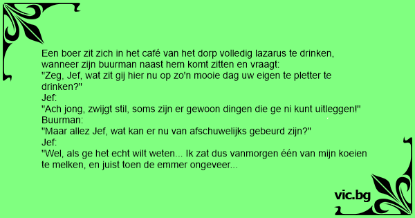 "Wel, als ge het echt wilt weten... Ik zat dus vanmorgen één van mijn koeien te melken, en juist toen de emmer ongeveer vol was, stoot ze met haar linkerpoot heel dienen emmer om!"
