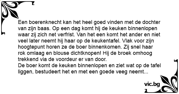 Een boerenknecht kan het heel goed vinden met de dochter van zijn baas. Op een dag komt hij de keuken binnenlopen waar zij zich net verfrist. Van het een komt het ander en niet veel later neemt hij haar op de keukentafel. Vlak voor zijn hoogtepunt horen ze de boer binnenkomen. Zij snel haar rok omlaag en blouse dichtknopen! Hij de broek omhoog trekkend via de voordeur er van door.
