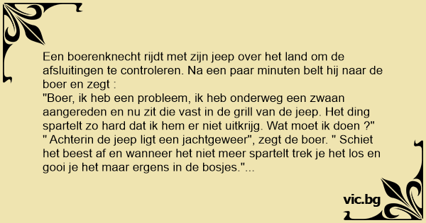 "Boer, ik heb een probleem, ik heb onderweg een zwaan aangereden en nu zit die vast in de grill van de jeep. Het ding spartelt zo hard dat ik hem er niet uitkrijg. Wat moet ik doen ?"