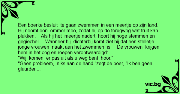 Een van de meiden roept: "We komen er niet uit voordat jij weg bent!" De oude man aarzelt niet en roept terug: "Ik ben niet gekomen om naar jullie te kijken of om jullie uit de vijver te...