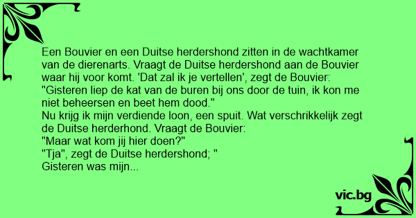 Een Bouvier en een Duitse herdershond zitten in de wachtkamer van de dierenarts. Vraagt de Duitse herdershond aan de Bouvier waar hij voor komt. 'Dat zal ik je vertellen', zegt de Bouvier: