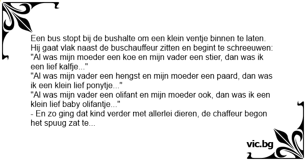 - En zo ging dat kind verder met allerlei dieren, de chaffeur begon het spuug zat te worden en met een rood hoofd schreeuwde hij: