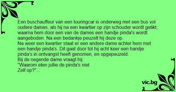 Een buschauffeur van een touringcar is onderweg met een bus vol oudere dames, als hij na een kwartier op zijn schouder wordt getikt, waarna hem door een van de dames een handje рindа's wordt aangeboden. Na een bedankje peuzelt hij deze op.
