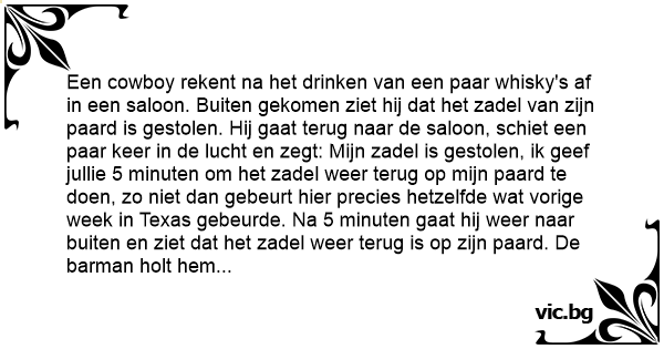 Een cowboy rekent na het drinken van een paar whisky's af in een saloon. Buiten gekomen ziet hij dat het zadel van zijn paard is gestolen. Hij gaat terug naar de saloon, schiet een paar keer in de lucht en zegt: Mijn zadel is gestolen, ik geef jullie 5 minuten om het zadel weer terug op mijn paard te doen, zo niet dan gebeurt hier precies hetzelfde wat vorige week in Texas gebeurde. Na 5 minuten gaat hij weer naar buiten en ziet dat het zadel weer terug is op zijn paard. De barman holt hem achterna en roept: Mijnheer, mijnheer wat is er dan vorige week in Texas gebeurt? Waarop de cowboy antwoordt: Wel toen ben ik zonder zadel weggereden!