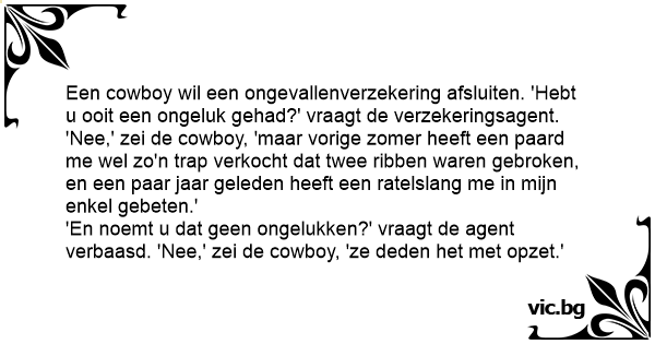 Een cowboy wil een ongevallenverzekering afsluiten. 'Hebt u ooit een ongeluk gehad?' vraagt de verzekeringsagent. 'Nee,' zei de cowboy, 'maar vorige zomer heeft een paard me wel zo'n trap verkocht dat twee ribben waren gebroken, en een paar jaar geleden heeft een ratelslang me in mijn enkel gebeten.'