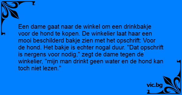Een dame gaat naar de winkel om een drinkbakje voor de hond te kopen. De winkelier laat haar een mooi beschilderd bakje zien met het opschrift: Voor de hond. Het bakje is echter nogal duur. "Dat opschrift is nergens voor nodig," zegt de dame tegen de winkelier, "mijn man drinkt geen water en de hond kan toch niet lezen."