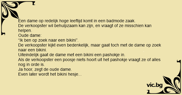 Een dame op redelijk hoge leeftijd komt in een badmode zaak.