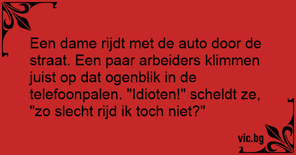 Een dame rijdt met de auto door de straat. Een paar arbeiders klimmen juist op dat ogenblik in de telefoonpalen. "Idioten!" scheldt ze, "zo slecht rijd ik toch niet?"