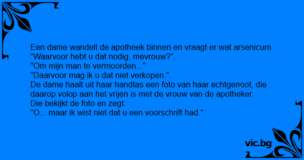Een man komt bij de apotheker en hij vraagt wat arsenicum voor zijn schoonmoeder. "heeft u een voorschrift?" zegt de apotheker? "nee, maar wel een foto!"
