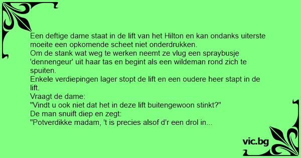 Een deftige dame staat in de lift van het Hilton en kan ondanks uiterste moeite een opkomende scheet niet onderdrukken.