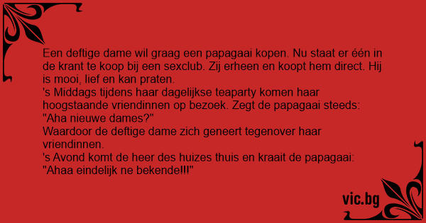 Нахлува НСБОП в столичен бардак. Папагал Der Papagei aus dem Puff Une maman décide d’acheter un animal de compagnie à ses deux filles. Frau Maier begibt sich in eine Tierhandlung und erblickt dort einen prächtigen Papagei. Една жена влязла в зоомагазин и видяла един много красив папагал. Продавачката побързала да обясни: Жена в зоомагазин: Един бардак фалирал и от него останал един папагал. Kommt eine Frau in die Tierhandlung und fragt nach einem Papagei. Der Verkäufer meint: Семья купила попугая, их предупредили, что он жил в борделе. Дома дочь скинула накидку с него, он тут же кричит: Ήταν κάποτε ένα παιδί και ήθελε να πάρει ένα παπαγάλο, και μάζευε λεφτά. Kάποια στιγμή ανοίγει τον κουμπάρα του, βρίσκει τριάντα ευρώ. Πάει στο κατάστημα με τα κατοικίδια και λέει: Μπαίνει η Χίλλαρυ Κλίντον σ ένα μαγαζί για ζώα. (Σιγά, ρε παιδιά, μη Josiane, mère de famille, se balade en ville lorsqu'elle passe devant une animalerie qui vend un perroquet seulement 50 €. Elle décide de rentrer et demande pourquoi il est si peu cher. La dame lui répond qu'ayant vécu dans une maison de passe il a un language un peu bizarre. Le prix étant... Uma senhora está farta de ficar sozinha a maioria do tempo e, procurando por companhia, resolve comprar um papagaio. Então ela entra em uma loja e pergunta o preço do animal, quando o dono da loja diz: — Olha, eu tenho esse papagaio aqui e lhe vendo por 20 reais! Ela fica feliz com o preço e... The Clintons took a break and went to Camp David for 10 days. While away, George Stephanapolis cared for the First Parrot. The pet parrot is not public knowledge because it has a fowl mouth. (Yes, that pun was certainly intended). George got irked... Un jour une femme décide d'acheter un perroquet à ses filles. Elle se rend donc au magasin d'animaux le plus près. Arrivée là, elle voit une aubaine pas croyable : 200 $ pour un magnifique... En dam kommer in i en zoo-affär för att köpa ett djur till sina döttrar. Efter att ha gått runt och tittat bestämmer hon sig för en papegoja. Expediten säger att den tidigare bott på en bordell och... Een hoerekot gaat failliet en de hele inboedel, waaronder een prachtige papegaai, wordt geveild. Een dame, vindt het echt zo'n prachtige papegaai, dat ze hem moet kopen, hij is ook helemaal niet... Жена си купила папагал от разпродажба на имуществото на публичен дом. Занесла го вкъщи и го сложила в гостната. Когато дъщерята се прибрала от училище, папагалът закрещял с все сила: - Нови к*урви... En kvinna köpte en talande papegoja. Expediten i djuraffären varnade henne att fågeln kom direkt ifrån en bordell och hade ett mycket speciellt ordförråd. Kvinnan var inte det minsta pryd, så hon... A menina tanto pedira que o pai, no dia do seu aniversário, comprou-lhe um papagaio, mal sabendo que a sua proveniência era de um famoso bordel da cidade.Depois de apagar as velinhas, todos os... Pewna kobieta przechodziła obok domu publicznego, gdzie odbywała się wyprzedaż sprzętów. Kupiła papugę w klatce, przyniosła ją do domu. Klatka była przykryta płachtą, która kobieta podniosła. - O,... En dam kliver in i en zooaffär, får syn på en papegoja och blir genast förtjust i fågeln. – Ursäkta, kan papegojan prata och är den till salu? frågar hon. – Jadå, den både pratar och är till salu.... Une femme va acheter un perroquet. Les prix sont de 100€, 200€ et 15€. Elle demande pourquoi le dernier et si peu chère par rapport au autres. - « C'est parce qu'il vivait dans un bordel » lui... Femeia merge in piata de animale. Vrea sa faca O suprinza sotului. - Buna ziua, doamna! - Buna ziua, as dori un papagal. - Din pacate, doar un singur papagal avem. Adevarat ca pina acum a trait la...