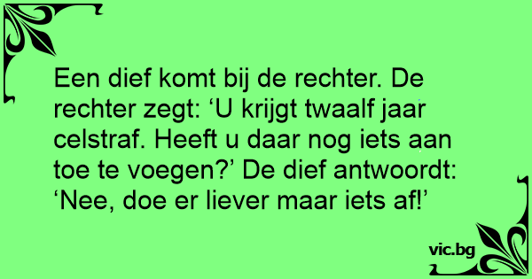 Een dief komt bij de rechter. De rechter zegt: ‘U krijgt twaalf jaar celstraf. Heeft u daar nog iets aan toe te voegen?’ De dief antwoordt: ‘Nee, doe er liever maar iets af!’