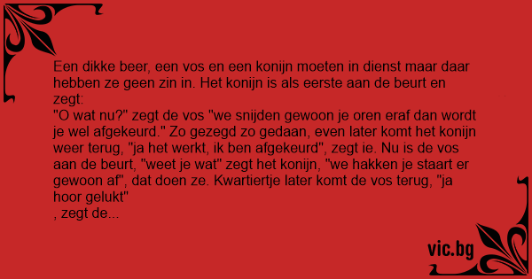 "O wat nu?" zegt de vos "we snijden gewoon je oren eraf dan wordt je wel afgekeurd." Zo gezegd zo gedaan, even later komt het konijn weer terug, "ja het werkt, ik ben afgekeurd", zegt ie. Nu is de vos aan de beurt, "weet je wat" zegt het konijn, "we hakken je staart er gewoon af", dat doen ze. Kwartiertje later komt de vos terug, "ja hооr gelukt"