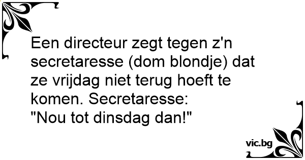 Een directeur zegt tegen z'n secretaresse (dom blondje) dat ze vrijdag niet terug hoeft te komen. Secretaresse: