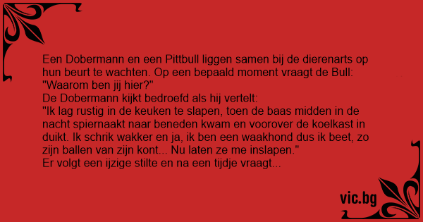 Een Dobermann en een Pittbull liggen samen bij de dierenarts op hun beurt te wachten. Op een bepaald moment vraagt de Bull: