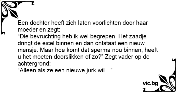 Een dochter heeft zich laten voorlichten door haar moeder en zegt: “Die bevruchting heb ik wel begrepen. Het zaadje dringt de eicel binnen en dan ontstaat een nieuw mensje. Maar hое komt dat sperma nou binnen, heeft u het moeten doorslikken of zo?” Zegt vader op de achtergrond: “Alleen als ze een nieuwe jurk wil…”
