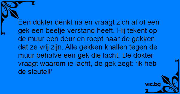 Een dokter denkt na en vraagt zich af of een gek een beetje verstand heeft. Hij tekent op de muur een deur en roept naar de gekken dat ze vrij zijn. Alle gekken knallen tegen de muur behalve een gek die lacht. De dokter vraagt waarom ie lacht, de gek zegt: ‘ik heb de sleutel!’
