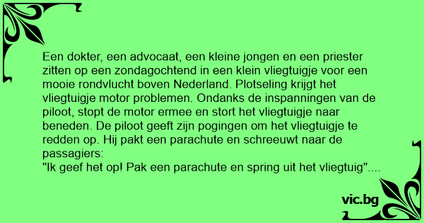 В един самолет пътували четирима души. Президент, Професор, Студент и Старец. По едно време самолетът се развалил и пилота им казал, че има само 3 парашута. Президентът грабнал първия парашут и казал: