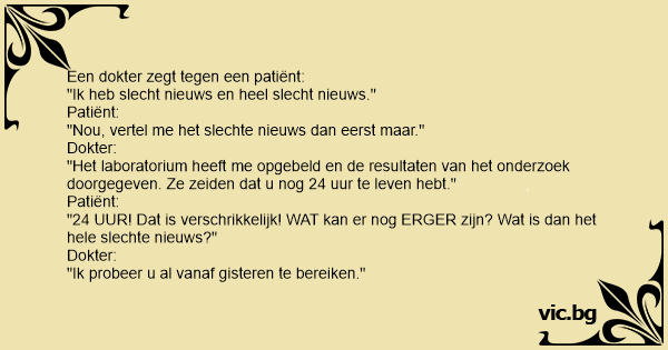 Вест Bad News El médico y la falta de comunicación Τον παίρνει ο γιατρός του τηλέφωνο και του λέει Ιατρικές εξετάσεις.. Доктор се обажда на пациент по телефона: Καλό ταξίδι! Doktor: Ich habe eine gute und eine schlechte Nachricht. Welche möchten Sie zuerst hören? Suena el teléfono: Doctor: I have some bad news and some very bad news. A doctor says to his patient, "I have bad news and worse news." My dotor told me: "I've tow news for U; one good and the other one bad, which one do U prefer to hear first?" I replied I prefer the good one. Doctor: "U will die after next 24 hours!" I told: "Then what is the bad newsrnDoctor: "I forgot to tell U yesterday!" Le docteur: j'ai une mauvaise et une très mauvaise nouvelle pour vous Le patient: quelle est la mauvaise? Le docteur: il vous reste 1 jour à vivre Le patient: C'est terrible, et quelle est la plus mauvaise nouvelle Le docteur: ça fait 24 heures que... Un docteur à son patient: - Mon pauvre ami, j'ai 2 mauvaises nouvelles à vous annoncer: La première: J'ai reçu les résultats de vos analyses. Vous avez une maladie incurable et il vous reste 6 mois... O médico chama seu paciente em seu consultório e diz: — Eu tenho uma noticia boa, e uma ruim para você. Qual você quer ouvir primeiro? — A boa — diz o paciente — Bom a boa e que você tem 24 horas... Lekarz telefonuje do pacjenta: - Mam dla pana dwie wiadomości - jedną dobrą, drugą złą. Którą chce pan najpierw usłyszeć? - Dobrą. - Zostało panu 7 dni życia. - A zła wiadomość? - Nie mogłem się do... Een man gaat naar het ziekenhuis omdat hij zich al dagen lang erg rot voelt. Hij word na een kort onderzoek direct opgenomen en ligt in een ziekenhuisbed te wachten op de dokter. De dokter komt... Stamattina mi ha telefonato il medico con una notizia brutta e una bruttissima: la brutta è che mi restano ventiquattr’ore di vita, e la bruttissima è che il medico si è dimenticato di dirmelo ieri... Le docteur dit à son patient : - J'ai une mauvaise et une très mauvaise nouvelle à vous annoncer. - Commencez par la mauvaise. - J'ai reçu les résultats de vos tests. L'analyse indique très... At the doctor's office, Tom was getting a check up. "I have good news and bad news," says the doctor. "The good news is you have 24 hours left to live." Tom replies, "That's the good news?!" Then... - Δυστυχώς σας μένουν 24 ώρες ζωή, αλλά αυτό δεν είναι το χειρότερο... - Μα τι λέτε γιατρέ ? Τι θα μπορούσε να 'ναι χειρότερο ? - Σας ψάχνω από χτες... Una paziente va dal dottore per sapere come sono andati gli esami che aveva fatto: "Allora dottore mi dica, com'è andata?" E il dottore: "Ho due notizie una buona e una cattiva" La donna: "Mi dica... Egy pácienst telefonon felhívja az orvosa: - Uram, tegnap megkaptuk a tesztek eredményét. Van egy rossz és egy még rosszabb hírem. - Mi a rossz hír? - Önnek halálos betegsége van, szóval maximum 24... 24 timer En mand møder op hos sin læge. Lægen siger: - Jeg nogle dårlige og nogle MEGET dårlige nyheder til dig. - Nåh. Lad mig få de MEGET dårlige nyheder først. - Du har 24 timer tilbage at leve...