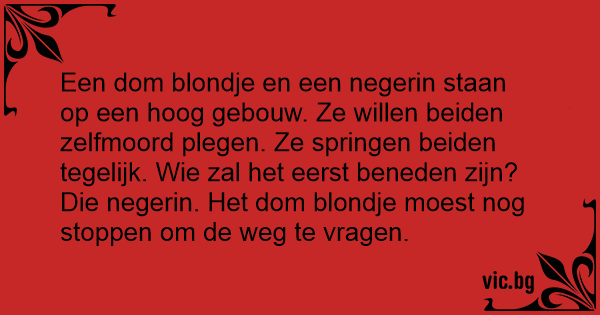 Een dom blondje en een negerin staan op een hoog gebouw. Ze willen beiden zelfmoord plegen. Ze springen beiden tegelijk. Wie zal het eerst beneden zijn? Die negerin. Het dom blondje moest nog stoppen om de weg te vragen.
