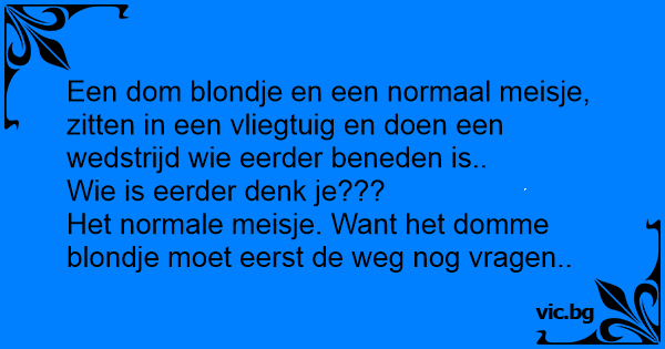 Een dom blondje en een normaal meisje, zitten in een vliegtuig en doen een wedstrijd wie eerder beneden is..