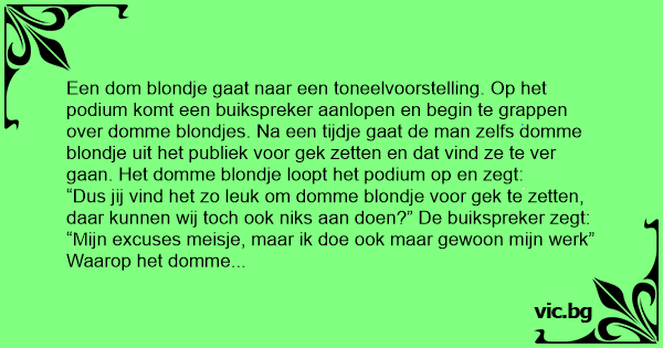 Een dom blondje gaat naar een toneelvoorstelling. Op het podium komt een buikspreker aanlopen en begin te grappen over domme blondjes. Na een tijdje gaat de man zelfs domme blondje uit het publiek voor gek zetten en dat vind ze te ver gaan. Het domme blondje loopt het podium op en zegt: