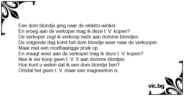 Er gaat een dom blondje naar de Elektrozaak. Op een gegeven moment vraagt ze aan de verkoper: "Ik wil graag dat televisietoestel kopen." Zegt de verkoper: "Ik verkoop niet aan domme blondjes. Het...
