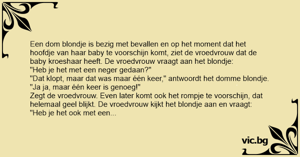 Een dom blondje is bezig met bevallen en op het moment dat het hoofdje van haar baby te voorschijn komt, ziet de vroedvrouw dat de baby kroeshaar heeft. De vroedvrouw vraagt aan het blondje: