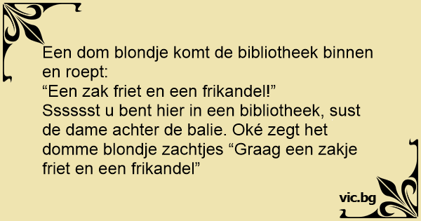 Sssssst u веnт hier in een bibliotheek, sust de dame achter de balie. Oké zegt het domme blondje zachtjes “Graag een zakje friet en een frikandel”