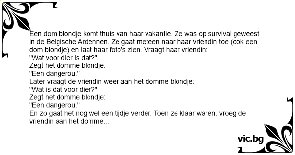 Een dom blondje komt thuis van haar vakantie. Ze was op survival geweest in de Belgische Ardennen. Ze gaat meteen naar haar vriendin toe (ook een dom blondje) en laat haar foto's zien. Vraagt haar vriendin: