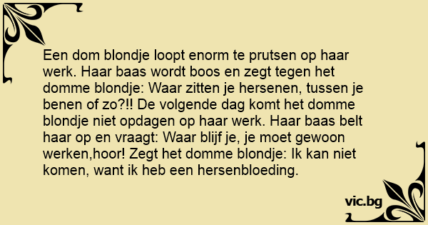 Een dom blondje loopt enorm te prutsen op haar werk. Haar baas wordt boos en zegt tegen het domme blondje: Waar zitten je hersenen, tussen je benen of zo?!! De volgende dag komt het domme blondje niet opdagen op haar werk. Haar baas belt haar op en vraagt: Waar blijf je, je moet gewoon werken,hооr! Zegt het domme blondje: Ik kan niet komen, want ik heb een hersenbloeding.