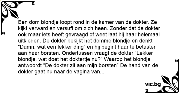 Een mooie, goedgevormde vrouw, ging naar de gynaecoloog. De dokter wierp een blik en vergat waar hij ooit voor had gestudeerd. Hij vroeg haar onmiddellijk om uit te kleden. Nadat zij daar naakt...