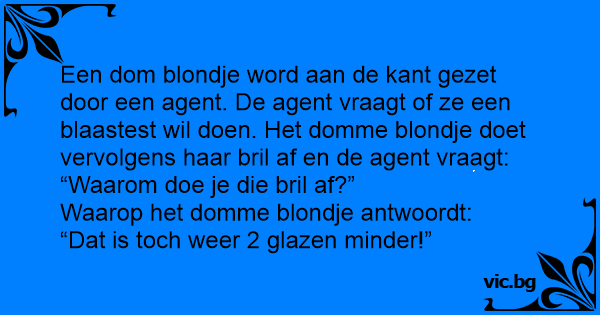 Een dom blondje word aan de kant gezet door een agent. De agent vraagt of ze een blaastest wil doen. Het domme blondje doet vervolgens haar bril af en de agent vraagt: