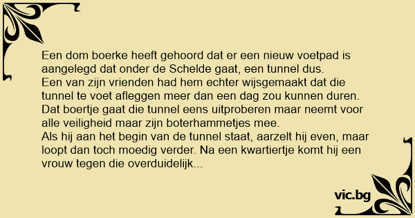 Een dom boerke heeft gehoord dat er een nieuw voetpad is aangelegd dat onder de Schelde gaat, een tunnel dus.