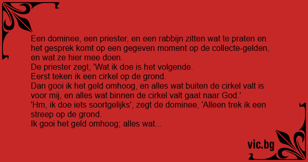 Een dominee, een priester, en een rabbijn zitten wat te praten en het gesprek komt op een gegeven moment op de collecte-gelden, en wat ze hier mee doen.