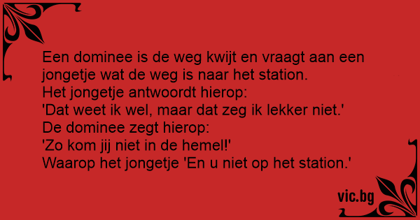 Een dominee is de weg kwijt en vraagt aan een jongetje wat de weg is naar het station. Het jongetje antwoordt hierop: 'Dat weet ik wel, maar dat zeg ik lekker niet.' De dominee zegt hierop: 'Zo kom jij niet in de hemel!' Waarop het jongetje 'En u niet op het station.'