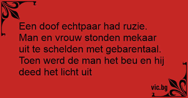 Een doof echtpaar had ruzie. Man en vrouw stonden mekaar uit te schelden met gebarentaal. Toen werd de man het beu en hij deed het licht uit