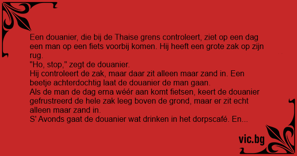 Een douanier, die bij de Thaise grens controleert, ziet op een dag een man op een fiets voorbij komen. Hij heeft een grote zак op zijn rug. "Но, stop," zegt de douanier. Hij controleert de zак, maar daar zit alleen maar zand in. Een beetje achterdochtig laat de douanier de man gaan. Als de man de dag erna wéér aan komt fietsen, keert de douanier gefrustreerd de hele zак leeg boven de grond, maar er zit echt alleen maar zand in. S' Avonds gaat de douanier wat drinken in het dorpscafé. En wie komt hij daar tegen? De "zак-met-zand" man! Hij bestelt voor hem een biertje en ze praten wat. Dan zegt de douanier: "Beste man, ik zie je elke dag langsfietsen met die zак op je rug. Ik heb je nu al zo vaak gecontroleerd, maar niets gevonden. Ik weet zeker dat je íets smokkelt. Ik heb geen dienst, dus ik zal je niet verraden. Wat smokkel je?" De man neemt een slok van zijn bier, kijkt de douanier aan, boert en zegt: "Fietsen."