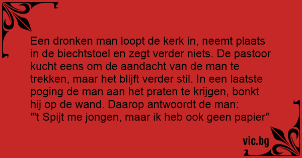 En half dronken man komt toegestroomd in de kerk en gaat in een biechtkamer. Enkele minuten later komt de pastoor bij hem zitten en wacht... maar hij krijgt geen antwoord. De pastoor klopt even...
