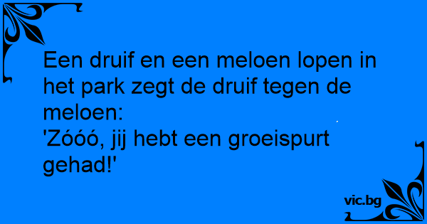 Een druif en een meloen lopen in het park zegt de druif tegen de meloen:<br />'Zóóó, jij hebt een groeispurt gehad!'