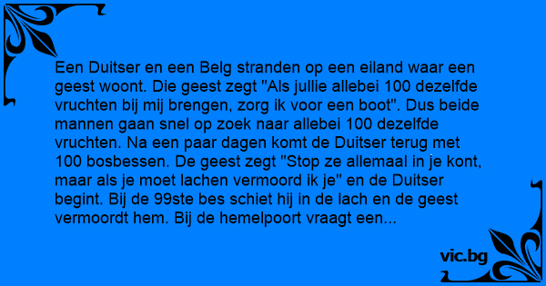 Een Duitser en een Belg stranden op een eiland waar een geest woont. Die geest zegt "Als jullie allebei 100 dezelfde vruchten bij mij brengen, zorg ik voor een boot". Dus beide mannen gaan snel op zoek naar allebei 100 dezelfde vruchten. Na een paar dagen komt de Duitser terug met 100 bosbessen. De geest zegt "Stop ze allemaal in je kont, maar als je moet lachen vermoord ik je" en de Duitser begint. Bij de 99ste bes schiet hij in de lach en de geest vermoordt hem. Bij de hemelpoort vraagt een engel "Waarom moest je nou lachen?". Antwoordt die Duitser "Nou, ik zag die Belg aan komen lopen met 100 kokosnoten!!"