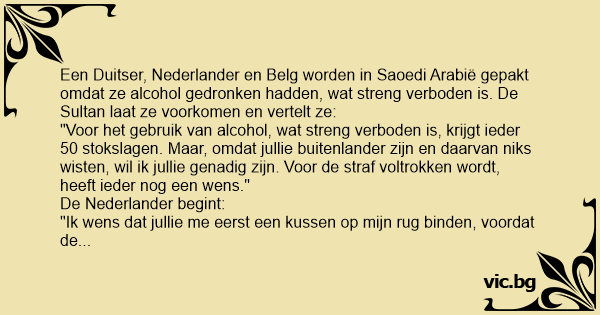 "Ok", zegt de Belg, al gedaan, "ten eerste wil ik geen 50 maar 100 stokslagen."