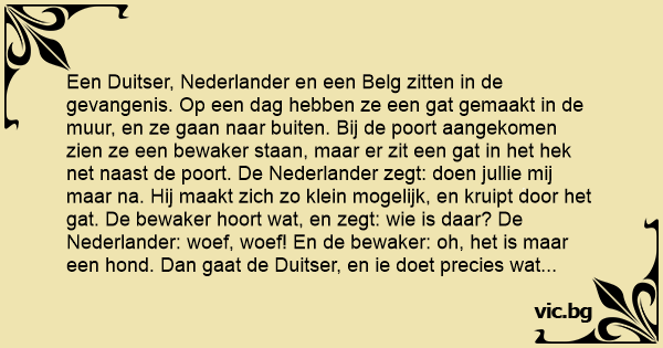 Een Duitser, Nederlander en een Belg zitten in de gevangenis. Op een dag hebben ze een gat gemaakt in de muur, en ze gaan naar buiten. Bij de poort aangekomen zien ze een bewaker staan, maar er zit een gat in het hek net naast de poort. De Nederlander zegt: doen jullie mij maar na. Hij maakt zich zo klein mogelijk, en kruipt door het gat. De bewaker hoort wat, en zegt: wie is daar? De Nederlander: woef, woef! En de bewaker: oh, het is maar een hond. Dan gaat de Duitser, en ie doet precies wat de Nederlander ook deed. De bewaker: wie is daar? De Duitser: woef, woef! Oh, het is maar een hond, zegt de bewaker weer. Dan gaat de Belg, weer zegt de bewaker: wie is daar? En de Belg: een hond!