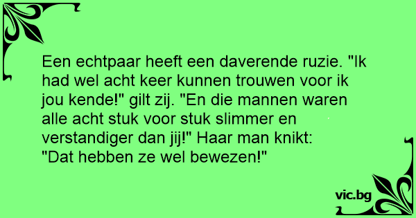 Een echtpaar heeft een daverende ruzie. "Ik had wel acht keer kunnen trouwen voor ik jou kende!" gilt zij. "En die mannen waren alle acht stuk voor stuk slimmer en verstandiger dan jij!" Haar man knikt:
