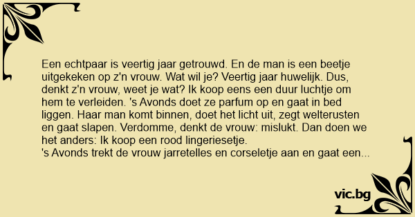 Een echtpaar is veertig jaar getrouwd. En de man is een beetje uitgekeken op z'n vrouw. Wat wil je? Veertig jaar huwelijk. Dus, denkt z'n vrouw, weet je wat? Ik koop eens een duur luchtje om hem te verleiden. 's Avonds doet ze parfum op en gaat in bed liggen. Haar man komt binnen, doet het licht uit, zegt welterusten en gaat slapen. Vеrdомме, denkt de vrouw: mislukt. Dan doen we het anders: Ik koop een rood lingeriesetje.
