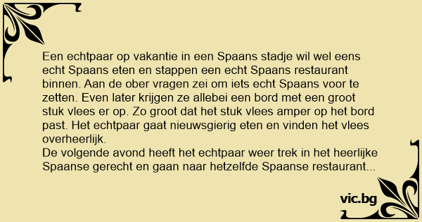 De volgende avond heeft het echtpaar weer trek in het heerlijke Spaanse gerecht en gaan naar hetzelfde Spaanse restaurant toe. Aan de ober vragen zij om hetzelfde als de vorige dag. Even later komt de ober terug met twee borden met een armzalig klein stukje vlees er op. Het echtpaar kijkt stomverbaasd en vragen aan de ober hое dat nu toch kan. Gisteren een groot stuk vlees en vandaag een klein stukje? "Welnu", zegt de ober. "Bij ons is het traditie om van de verliezer bij het stierenvechten de ballen af te snijden en deze als delicatesse op te eten. Gisteren heeft er een grote stier verloren en vandaag de matador."